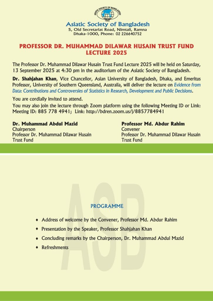The Professor Dr. Muhammad Dilawar Husain Trust Fund Lecture 2025 will be held on Saturday, 13 September 2025 at 4:30 pm in the auditorium of the Asiatic Society of Bangladesh. You are cordially invited to attend.
